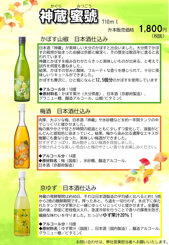 キャンペーン情報 おすすめ商品のご紹介です! 松井酒造(京都)さんの 神蔵蜜號(かぐらみつごう) 日本酒「神蔵」×かぼす&梅&京ゆずのマリアージュ! この機会に是非、お試しください!! こちらをクリックしてください。
